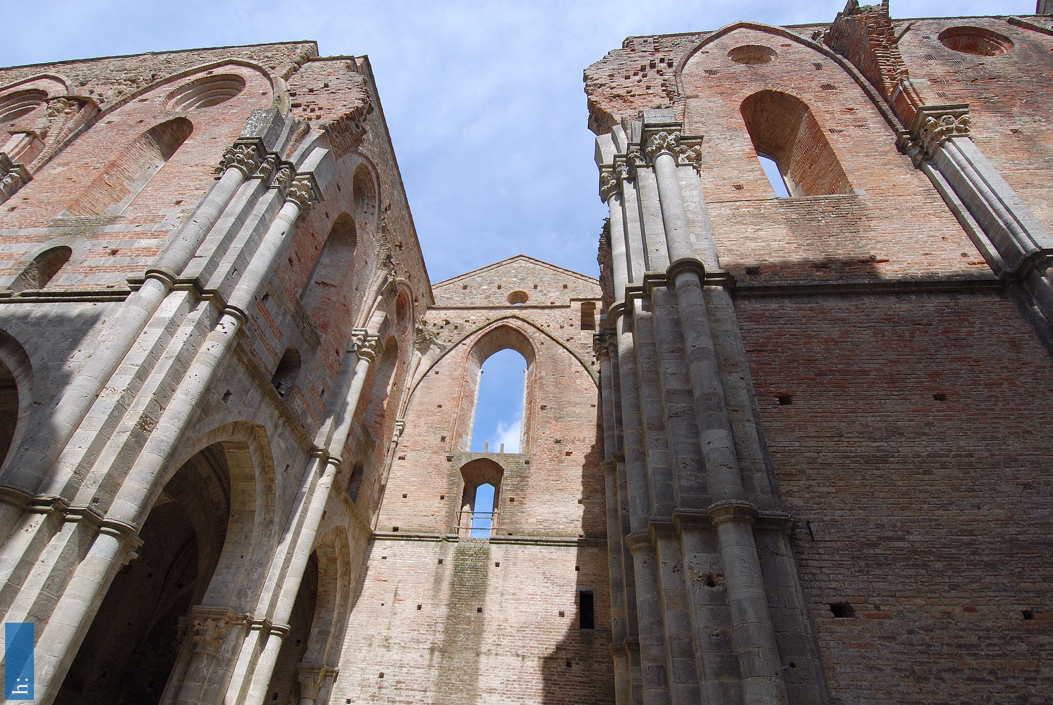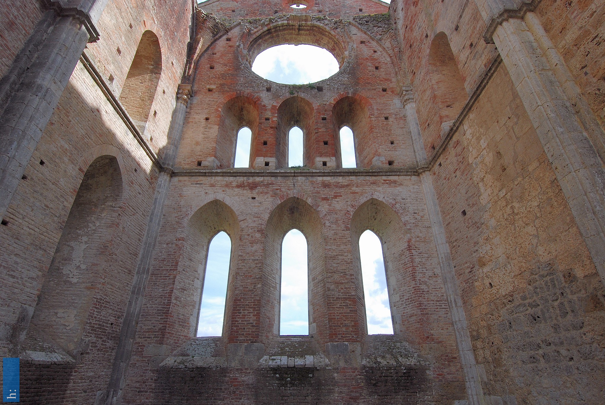 DSC_0806 Abbazia di San Galgano Der Wandaufbau des Mittelschiffs ist nicht einheitlich. Der ältere Ostteil ist viergeschossig: Auf die Arkadenzone folgt eine Reihe...